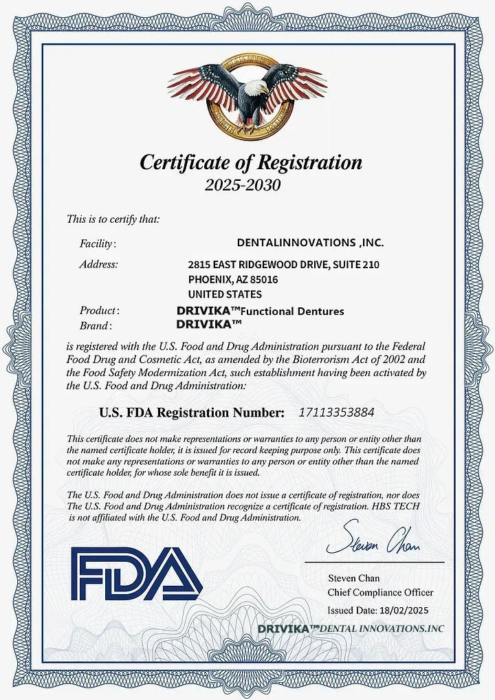DRIVIKA® - Premium Denture is designed for a perfect, secure fit. Thanks to its natural suction and customizable molding process, the denture will stay firmly in place, even while eating or speaking. It provides a stable and comfortable fit, so you can enjoy your day without worry.